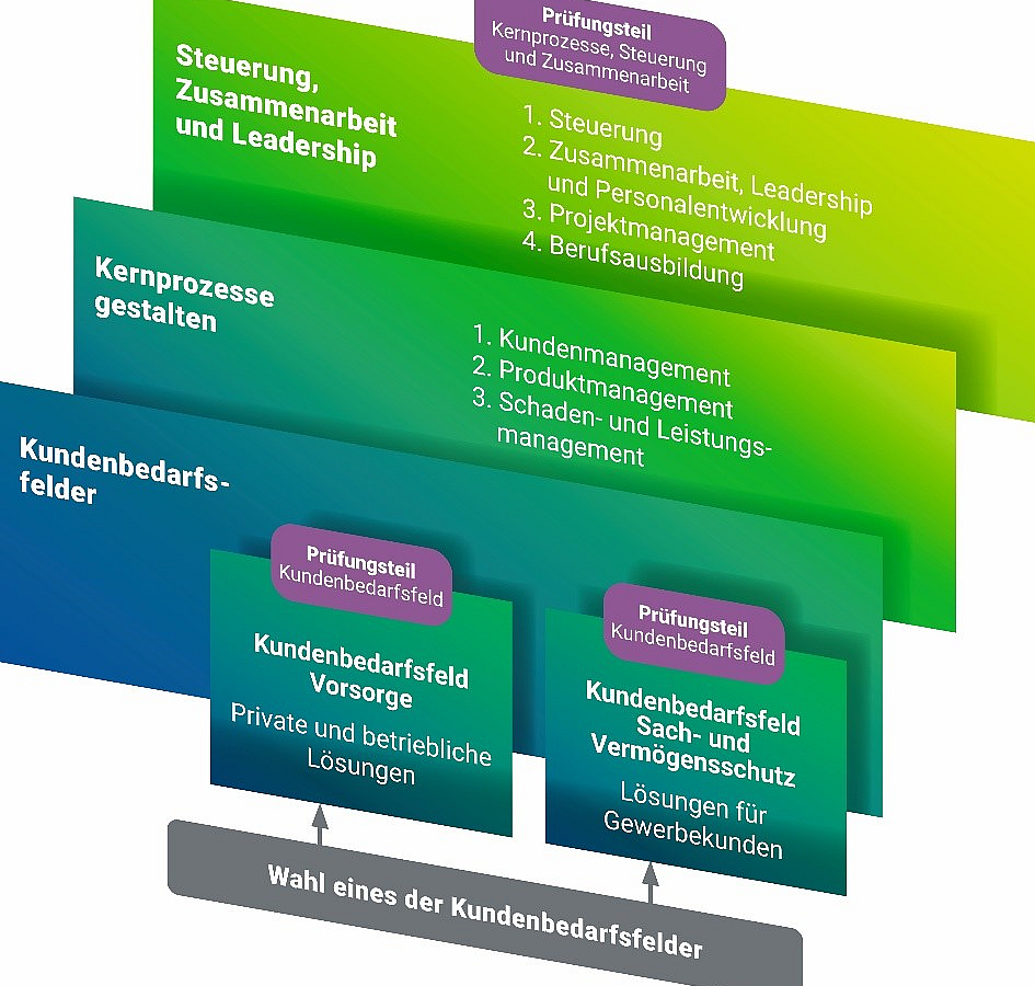 Hier werden die Grundlagen der Versicherungswirtschaft vermittelt, ergänzt durch Themen zur Steuerung, Führung und effektiven Zusammenarbeit im Arbeitsumfeld.2. Kernprozesse in der Versicherungswirtschaft